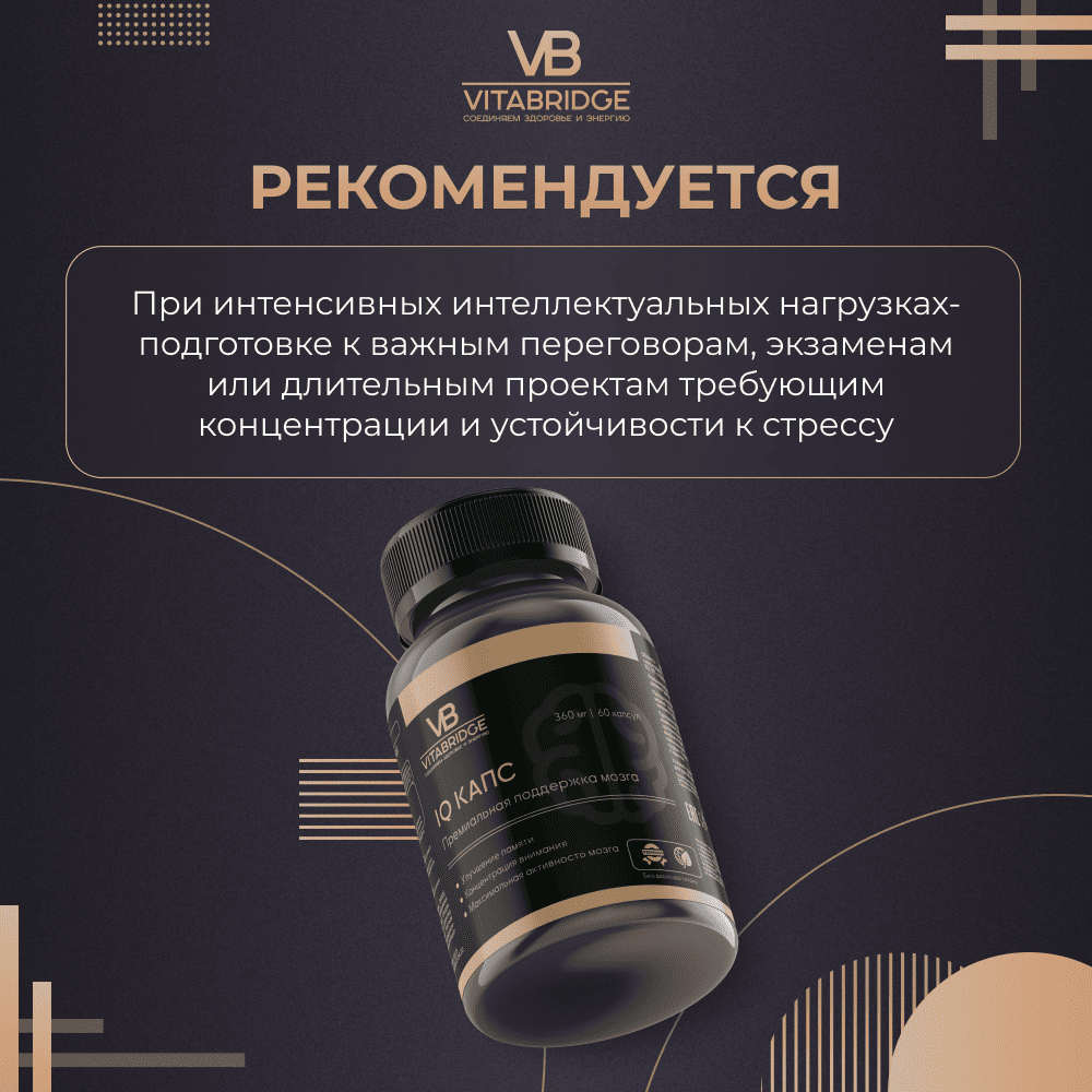 Чтобы стресс, недосып и возрастные изменения не могли негативно повлиять на когнитивные способности и работу Вашего мозга, позаботьтесь о его поддержке, выбрав в качестве эффективного помощника премиальную формулу IQ КАПС от VITABRIDGE.