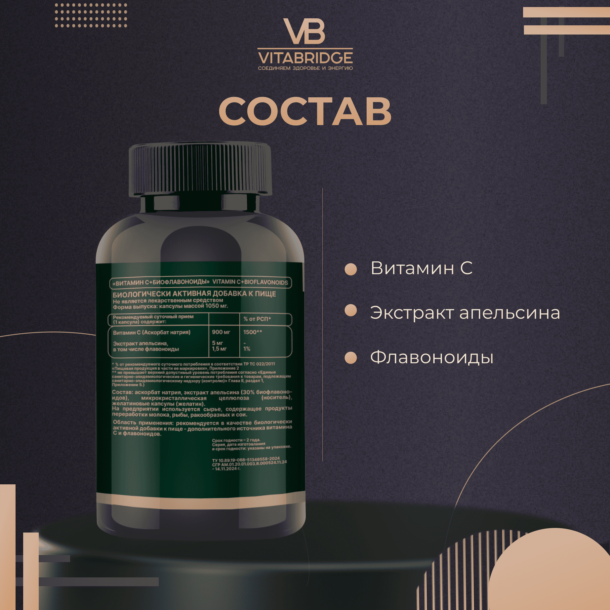 Выстраивайте мощную линию защиты и поддерживайте свой организм в любое время, заказывая ВИТАМИН С + БИОФЛАВОНОИДЫ от VITABRIDGE сейчас!