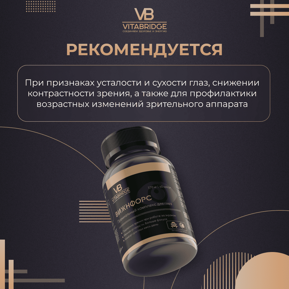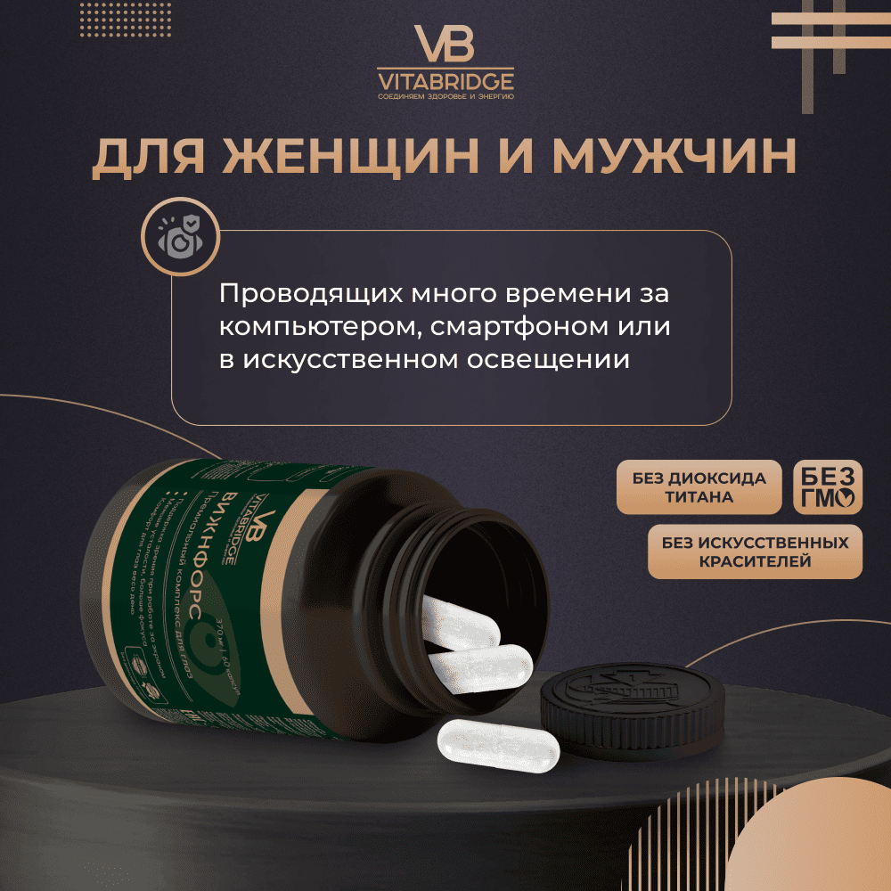 Ежедневное воздействие синего света от экранов гаджетов, стресс, возрастные изменения и плохая экология неустанно снижают остроту зрения и ухудшают здоровье глаз. Для поддержки и защиты зрения VITABRIDGE e представляет премиальный комплекс для глаз ВИЖНФОРС.
